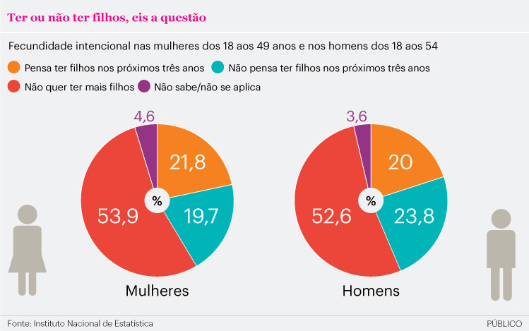 Mais de metade dos homens e mulheres portugueses em idade fértil não pensa ter filhos ou mais filhos. Se juntarmos a este número os que não tencionam ser pais nos próximos três anos, a percentagem sobe para 75,1%. Entre estes, os custos financeiros associados à maternidade e paternidade são o motivo mais indicado para não ter filhos. Feitas as contas, até 2017, apenas um quinto das mulheres e homens planeiam ter filhos em Portugal. São 20,8% em média, ponderando esse desejo nas mulheres (21,8%) e nos homens (20%).