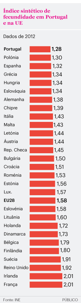 Em 2012, Portugal foi, entre os 28 da União Europeia, o país com o menor índice de fecundidade.